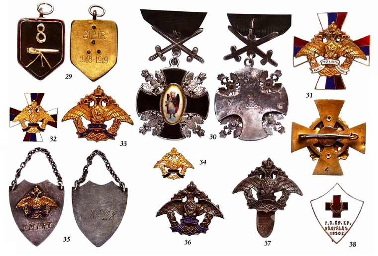 29. Жетон чехословацкого легионера-пулеметчика 8-го стрелкового полка в виде нарукавного знака с надписью «SIBIR 1918 — 1919». Бронза, эмаль. Размер — 30x22 мм.