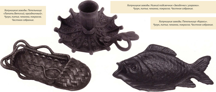 Модельный ассортимент продукции Холуницких заводов схож с товарами, производимыми ведущими предприятиями Урала. Особую искусность в декоре изделий проявляют точность литья и качество литейной формы. Детали изящно и четко проработаны. На сегодняшний день мне известны пять образцов художественного литья с рельефной поверхностью, изготовленных на Холуницких заводах и маркированных заводским клеймом. Эти клейма условно можно разделить на два типа: первый тип наносился вручную во время формовки изделия в опоке, второй находился на самой модели и отливался вместе с ней. Возможно, это указывает на то, что в первом случае в качестве модели использовались изделия других заводов, а во втором - модели изготавливались на Холуницких заводах. Одним из самых выдающихся образцов является пепельница «Лапоть Вятский, праздничный».